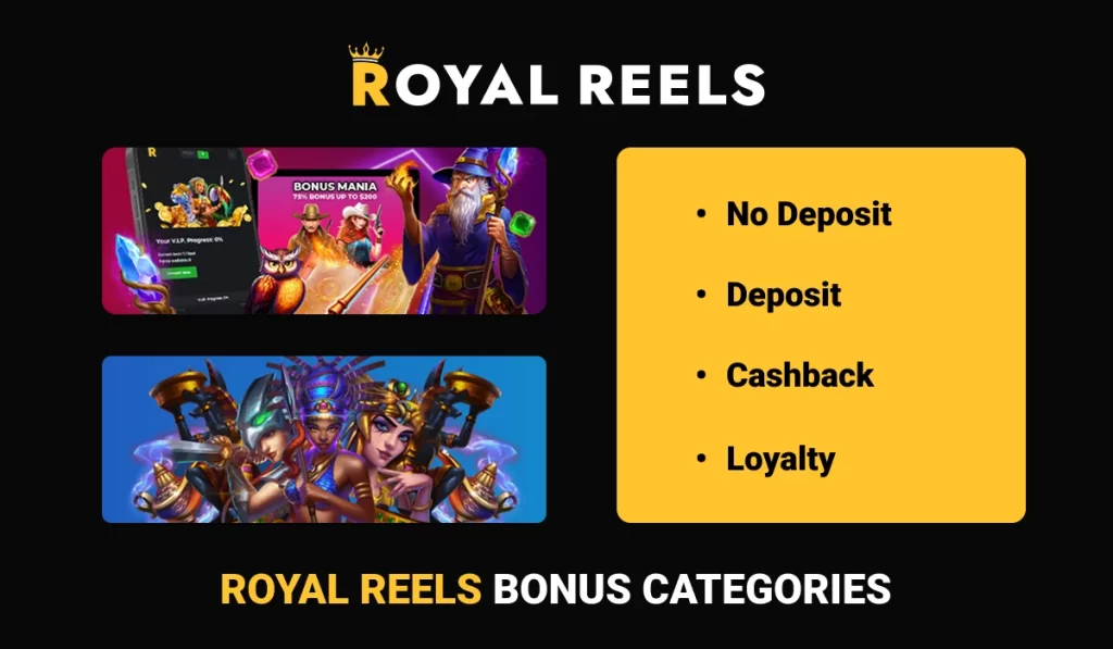 Royal Reels provides no-deposit, deposit/reload, cashback, free spins, and loyalty perks to boost bankrolls and extend gameplay across slots, table games, and live titles.